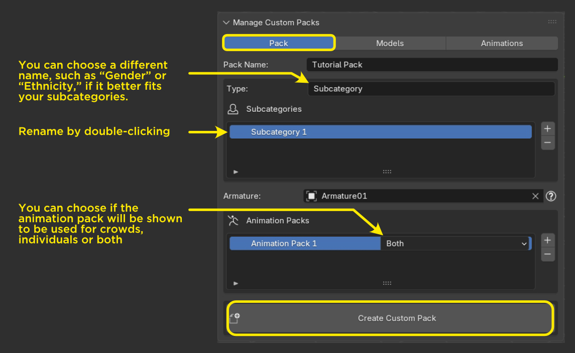 Create and name your animation packs. You can add or remove animation packs later from the Animations section, also you can choose what animation packs can be used in crowds, individuals or both.