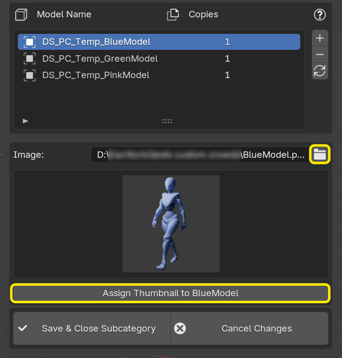 To assign a thumbnail click the image icon to select it, then click Assign Thumbnail to assign the selected image to the model currently selected in the list.
