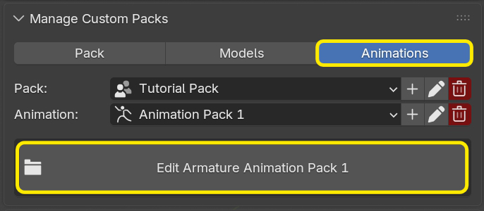 Before creating animation packs select the armature of any of your models. It does not matter which one you choose, as all armatures must be compatible with the animations you plan to add.