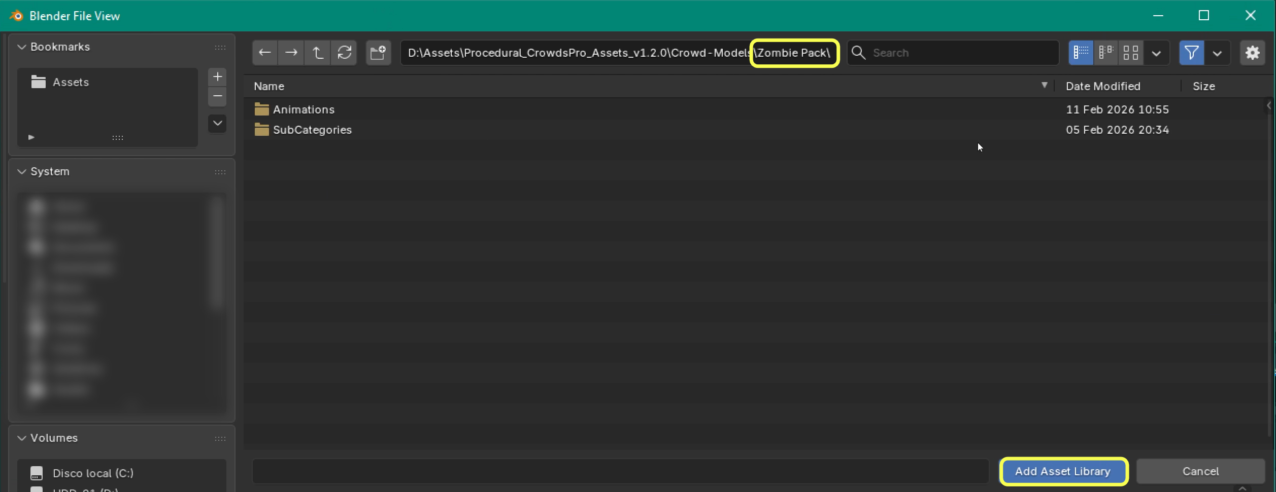 If you are using Procedural Crowds, go to the Procedural Crowds assets folder and select the same "Zombie Pack" folder that we copied earlier (Go into the folder and click on Add Asset Library).